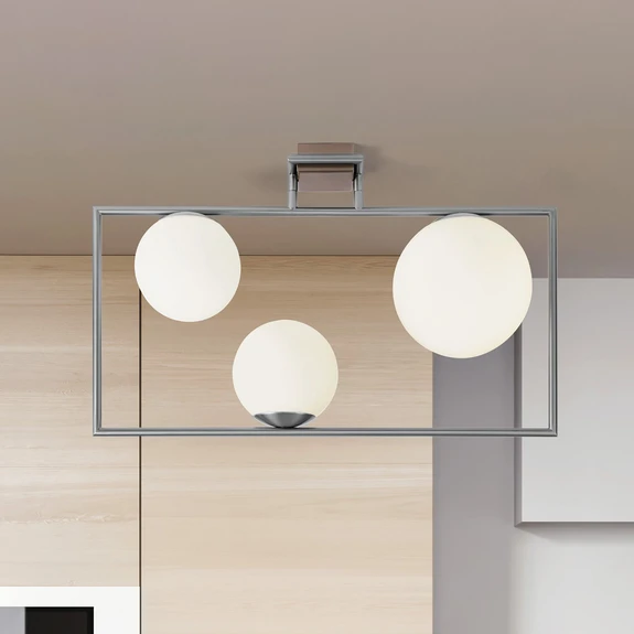 Buble taklampe i børstet stålfinish med tre opale glasskuler Buble-serien, som er skapt av den italienske arkitekten og designeren Davide Negri, kjennetegnes av de sfæriske lampeskjermene i opalt glass i ulike størrelser, som er plassert i en rektangulær metallramme. Denne taklampen er utstyrt med tre lampeskjermer, som hver rommer en fatning og gir mykt lys på alle sider. Metallrammen og den firkantede baldakinen har en finish i børstet stål.