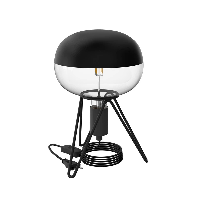 For store lyskilder: Tripod bordlampe med separat rammeI Tripod bordlampe er rammen og sokkelen løsrevet fra hverandre, noe som gir stor fleksibilitet i valget av E27-lyskilde som skal brukes. Det må imidlertid velges en lampe med en diameter på minst 12,5 cm. Egnede varianter kan kjøpes separat via tilbehøret. Lampen plasseres ovenfra på stativrammen laget av metall og lakkert i en farge. Lengden på lampens base er irrelevant, da stikkontakten som er koblet til strømkabelen ikke er permanent festet til rammen. En bryter er også integrert i strømkabelen.Merk: For pærer med en diameter på minst 12,5 cm.