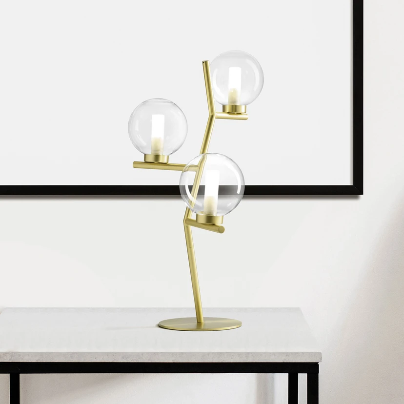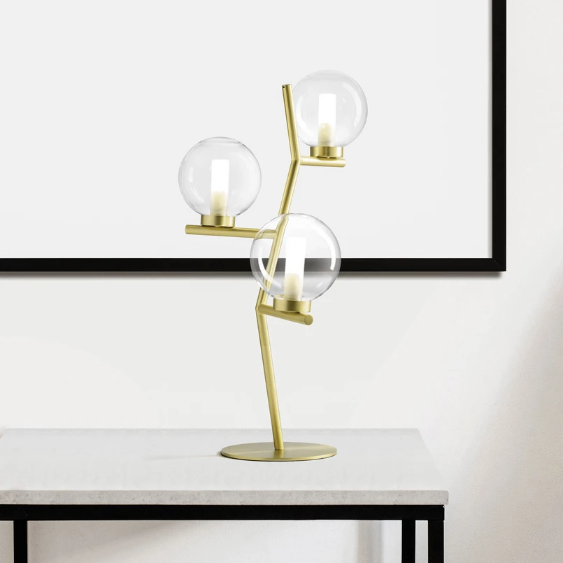 Camely bordlampe, 3 lyskilder, børstet gull/klar, glass
