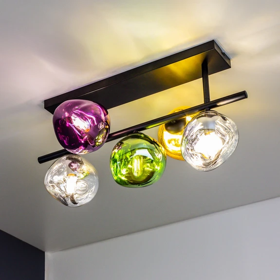 Canopus taklampe med 5 lyskilder og nesten sfæriske lampeskjermer i farget glass Canopus taklampe tiltrekker seg alles oppmerksomhet med sine fem fargede lampeskjermer i glass, som er utformet i en lavalignende, smeltet kuleform. Glassskjermene kommer i to sølvfargede nyanser og én hver i gull, grønn og fiolett, og hver av dem har plass til en fatning med E14-pære (bruk rørformede pærer). Det svarte armaturet med armstruktur og rektangulær baldakin er laget av aluminium.