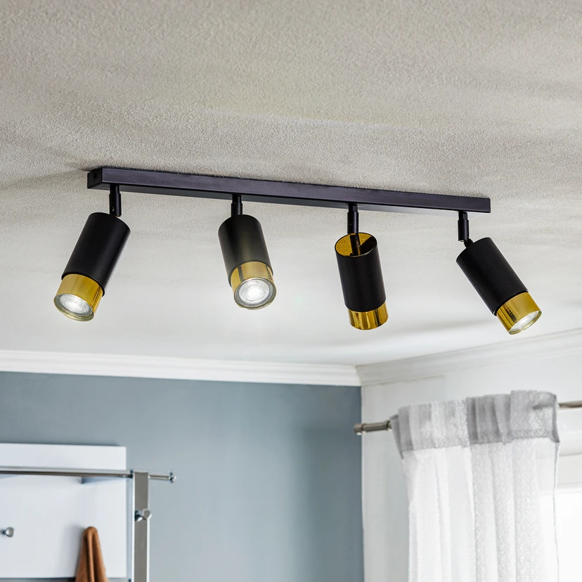 Downlight Kumo i svart og gull kombinerer moderne design med funksjonell eleganse. Denne spotlights med 4 lyskilder er laget av pulverlakkert stål av høy kvalitet og passer perfekt inn i ulike oppholdsrom som stue, gang, kjøkken og spisestue. Den stilige kombinasjonen av svart og gull gir ethvert rom et spesielt preg og skaper en behagelig lysatmosfære.