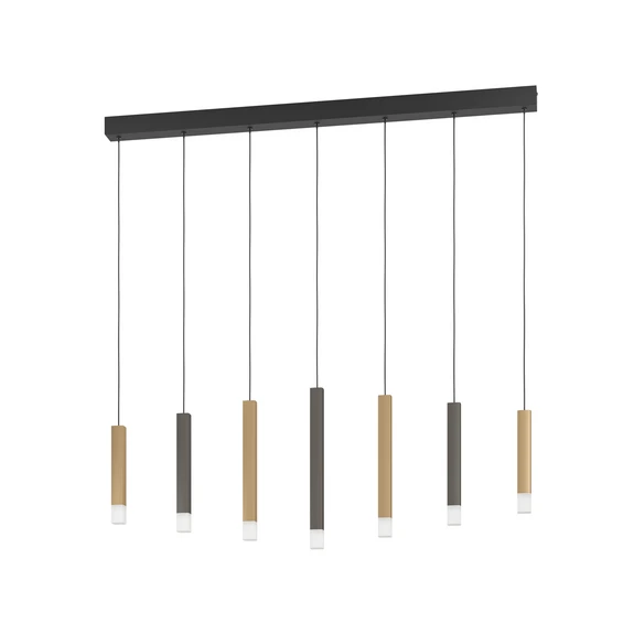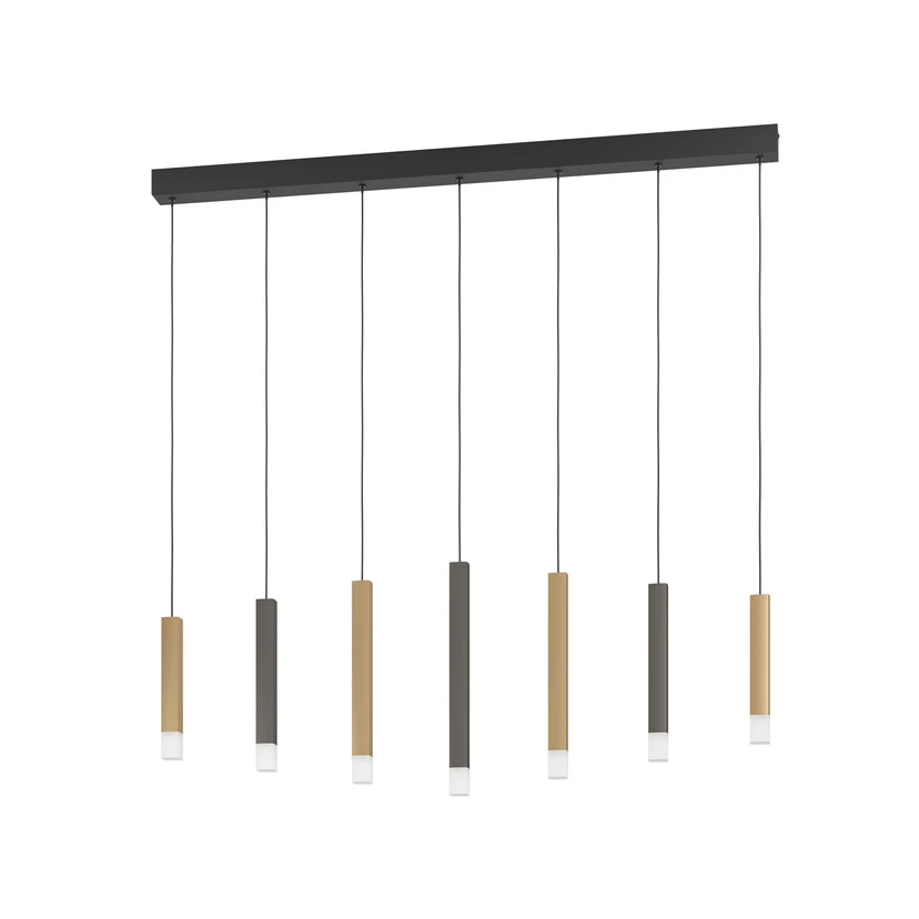 LED-hengelampen Estanterios er en moderne lampe som passer spesielt godt til belysning av et langt bord eller en bar. Armaturen er laget av høykvalitets aluminium, stål og plast og har syv lyselementer i svart, brunt og gull som henger fra lange baldakiner og er utstyrt med satinert diffusor i plast i bunnen. Dette gjør at lyset fra de innebygde varmhvite LED-lampene blir jevnt og blendingsfritt.