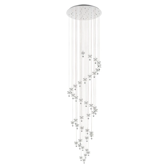 Den runde LED-hengelampen Pianopoli imponerer med en fascinerende lyseffekt fra klare glasselementer med slip som skimrer i lyset og minner om blomster. Fra den runde baldakinen henger spiralformede halvrunde metallskåler med varmhvite LED-pærer. Disse avgir lyset oppover og lyser opp de utallige glasselementene over, slik at disse glitrer i lyset. Dette spesielle og ekstravagante designet og det lange opphengssystemet gjør hengelampen Pianopoli til en fascinerende lyskilde som også passer til høye rom, gallerier eller trappeoppganger og blir et blikkfang. Lampen er utstyrt med en dimbar LED-driver og dimbare LED-er, og lysstyrken kan også reguleres via en dimmer i rommet.