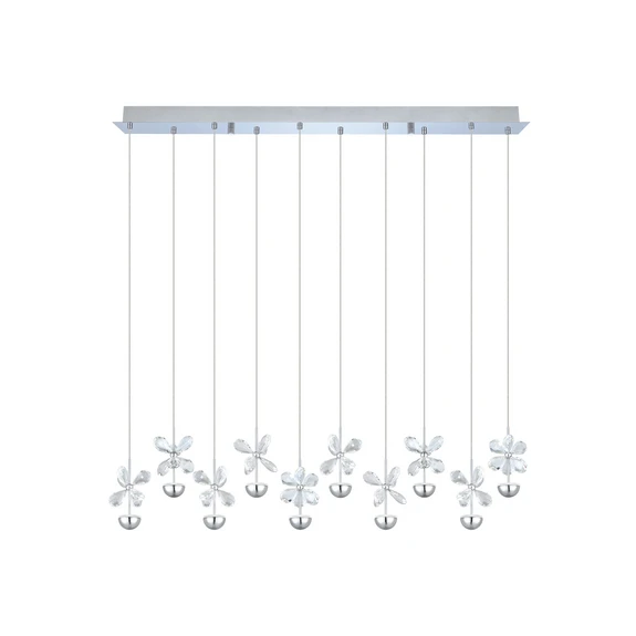 Den lange LED-hengelampen Pianopoli imponerer med en fascinerende lyseffekt fra klare glasselementer med slip som glitrer i lyset og minner om blomster. Disse henger fra den lange baldakinen og blir belyst av varmhvite LED-er i de halvrunde metallskålene under, slik at de glitrer i lyset og gir et helt spesielt skinn til ethvert rom. Det spesielle og ekstravagante designet gjør hengelampen Pianopoli til en fascinerende lyskilde og et blikkfang i et rom, for eksempel over et langt bord i spisestuen. Lampen er utstyrt med en dimbar LED-driver og dimbare LED-er, slik at lysstyrken kan reguleres etter ønske via en ekstern dimmer i rominstallasjonen.