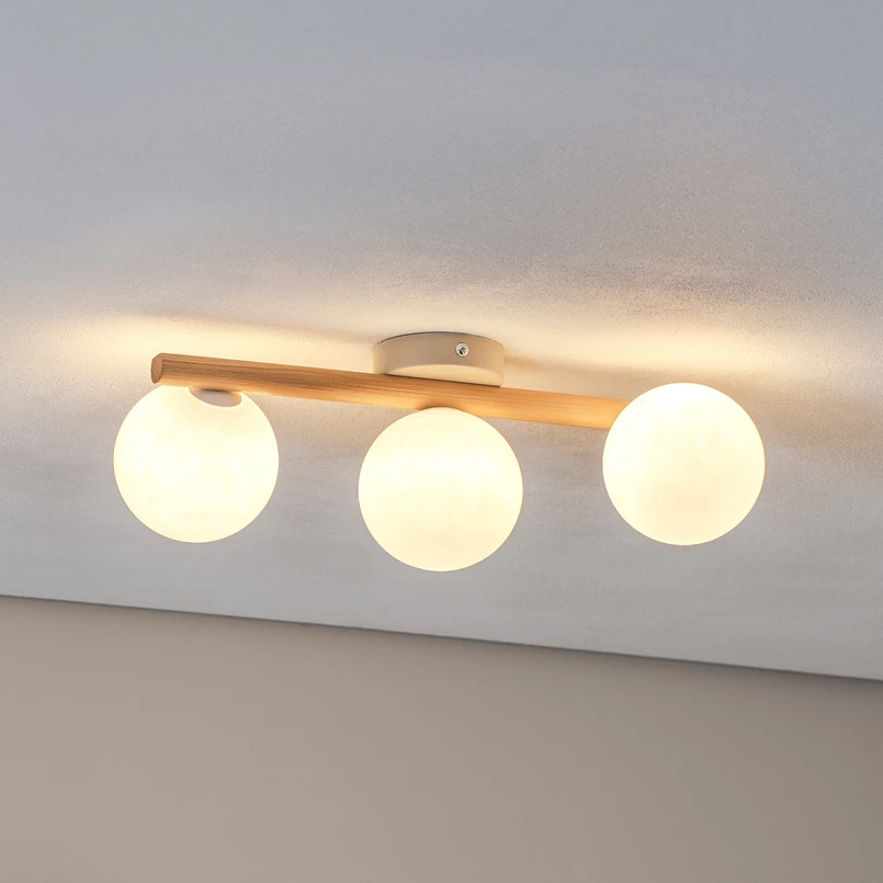 Estera taklampe med trebjelke og tre kuleformede skjermer i opalt glass Med sine tre kuleformede skjermer i opalt glass, som hver har en fatning med G9-sokkel, gir Estera taklampe behagelig belysning på alle sider. Lampen har også en bjelke i lyst tre og en baldakin i hvit metall.