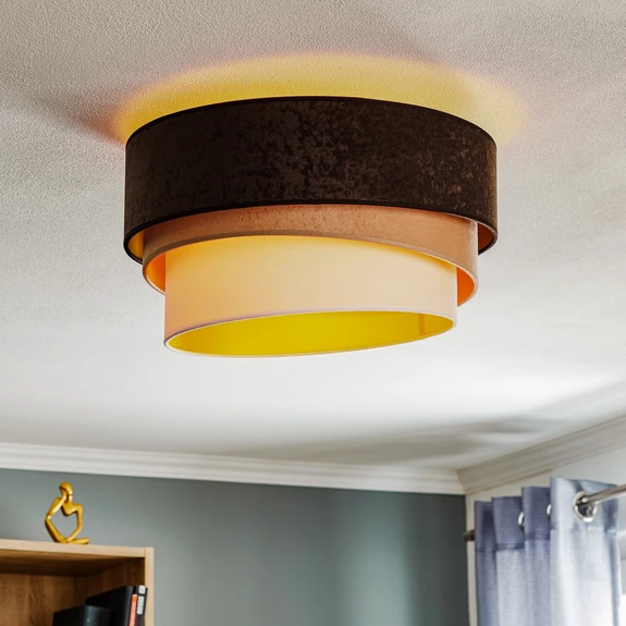 Euluna Devon taklampe kombinerer stilig eleganse med funksjonell allsidighet og er et høydepunkt for moderne oppholdsrom. Denne lampen er laget av høykvalitets stoff og PVC og imponerer med sin harmoniske fargekombinasjon av brun, beige, ecru og gull. Disse nøye utvalgte fargene gir hvert rom en varm og innbydende atmosfære. Muligheten for dimbarhet via en ekstern dimmer gir ekstra fleksibilitet for å tilpasse lysintensiteten til forskjellige behov og stemninger.