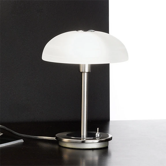Fonta bordlampe: moderne symbiose av glass og metall Fonta bordlampe er en behagelig og elegant lyskilde i både private oppholdsrom og hotellobbyer. Skjermen av opalt, alabastlignende strukturert glass er trukket nedover på sidene, er blendfri og kompletterer stilfullt stålkonstruksjonen med sine dyktig kontrasterende seksjoner. Fonta bordlampe betjenes ved hjelp av vippebryteren på lampens fot. Merk: Den maksimale lengden på pæren som kan brukes, er 4,3 cm.