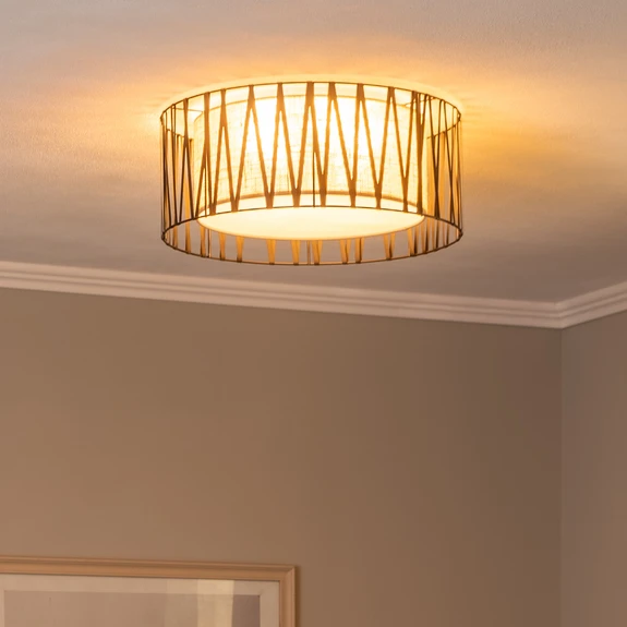 Svart Harmony taklampe med innvendig skjerm av jute tekstil Harmony taklampe er laget av svartlakkert stål. Den sylinderformede lampeskjermen består av en ytre sfære dekket med bånd og et indre element laget av naturlig brun jute-tekstil. Undersiden er utstyrt med en hvit diffusor.