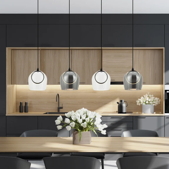 Belysningskonsept for spisestuer: LED-pendellampe 23082 med integrert lyskilde LED-pendellampen 23082 forvandler spisestuen til et inspirerende og koselig rom. Den 4 lyskilder store armaturen med glasselementer av høy kvalitet gir ikke bare et attraktivt utseende, men også en energieffektiv belysningsløsning. De integrerte LED-lampene skaper en hyggelig atmosfære for bespisning og sosialt samvær, samtidig som energiforbruket minimeres. Armaturen er ideell for spisestuen og skaper en lysopplevelse som både løfter stemningen og støtter rommet i sin funksjon - Farge på lampeskjermene: 2 x klar, 2 x røykgrå