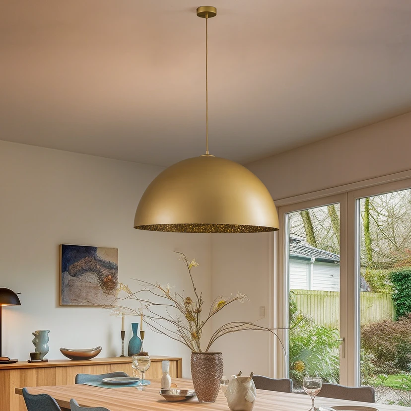 Hengelampen Fera imponerer med sitt moderne design og kombinasjonen av stål og mineralsk komposittmateriale. Den gullfargede og svart-gullsprinklede overflaten gir ethvert rom et luksuriøst preg. Enten i stuen, på kjøkkenet eller i spisestuen – denne lampen setter stilfulle aksenter og skaper en innbydende atmosfære.