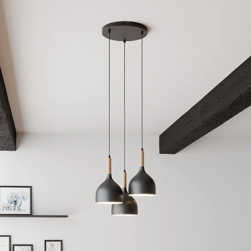 Hengelampen Noak med 3 lyskilder, rund i svart og naturtre, kombinerer moderne design med naturlige elementer. Den er laget av høykvalitets metall og tre og passer perfekt inn i ulike interiørstiler. Kombinasjonen av svart metall og lyst tre gir lampen en tidløs eleganse som setter preg på både stuen, kjøkkenet og spisestuen.