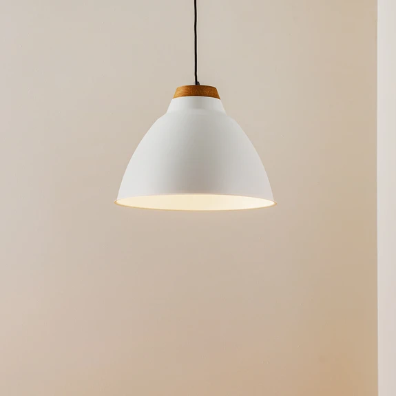 Hengelampen Skal forener moderne og skandinavisk design i en harmonisk kombinasjon av metall og lyst tre. Denne stilfulle lampen er holdt i en elegant hvit farge som passer perfekt inn i ulike romkonsepter. Enten i stuen, på kjøkkenet eller i spisestuen – hengelampen Skal setter accenter overalt og skaper en behagelig atmosfære.
