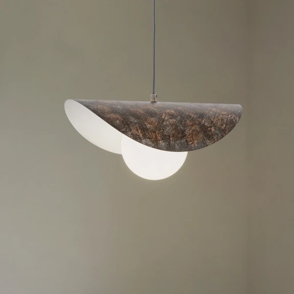 Hengelampen Vatoz i svart med opalglass kombinerer antikk design med funksjonell belysning og skaper dermed en atmosfære som kan virke både inspirerende og beroligende.