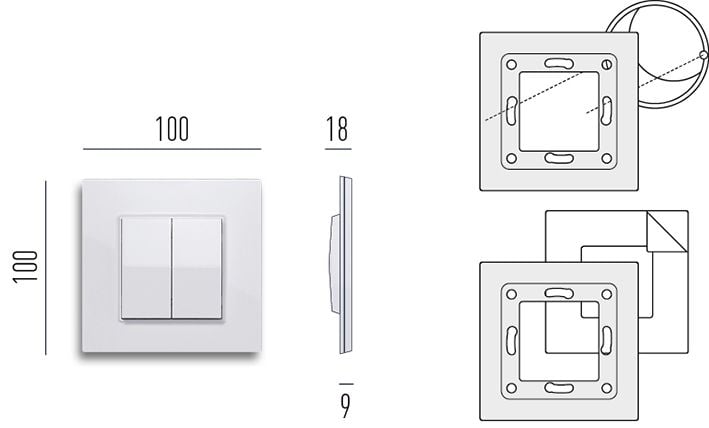 - for skruemontering på en innfelt boks eller for limmontering med teip (inkludert i leveransen) på en hvilken som helst egnet overflate