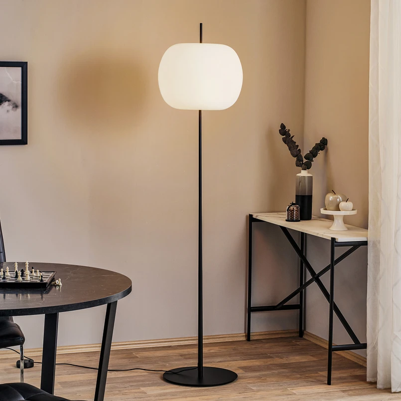Den minimalistisk utformede gulvlampen består av en kjegleformet søyle på en rund fot, som bærer en dobbeltlags, munnblåst kule av opalglass. Kulen ser ut som den er spiddet, fordi søylen stikker ut av lyskulen på toppen. Resultatet er et unikt design som kan integreres i mange interiørstiler og samtidig skaper en behagelig, hyggelig lysatmosfære. Det hvite glasset i skjermet lar lyset skinne ut i omgivelsene uten å blende, og lysstyrken kan justeres med den innebygde dimmerbryteren.