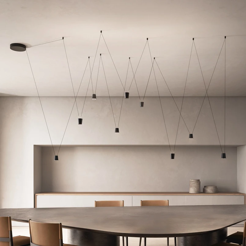 Leveransen inneholder en lampe, en kabelholder og 4 meter kabel. Med driverkit (driver, 4 kabelholdere og 10 meter kabel) som fås under tilbehør, samt et tilsvarende antall enkeltlamper Sling, kan du realisere mange forskjellige varianter, som vist på produktbildene. Lampene kan plasseres slik at de avgir lys direkte eller indirekte.