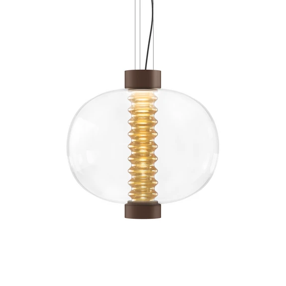 LED-hengelampen Bolha er innrammet av aluminiumshetter øverst og nederst på skjerm. Disse ser ut til å holde den runde, gjennomsiktige glasskjerm av borosilikatglass. I midten av skjermen går en farget, bølgeformet rørpære, som består av munnblåst glass og inneholder varmhvite LED-pærer. De forskjellige glasselementene skaper lysbrytninger som gir stemningsfulle lysbilder og gir lampen sin spesielle sjarm. Opphengssystemet er festgjort i tre elegante stålkabler og ender i en brun baldakin som harmonisk kompletterer helhetsinntrykket. Bolha er ideell for bruk i stuer og over spisebordet, da den avgir lyset rundt seg og lyser opp rommet på en myk måte.