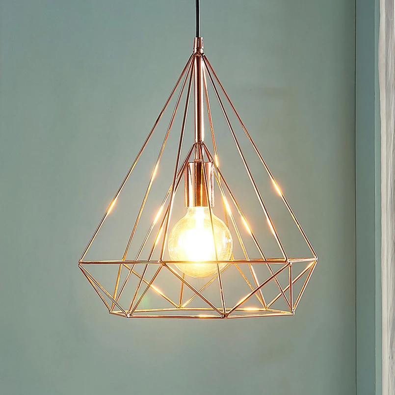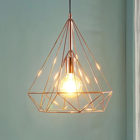 Et designorientert belysningsobjekt med kobberfarget overflate: pendellampen Jossa med burform