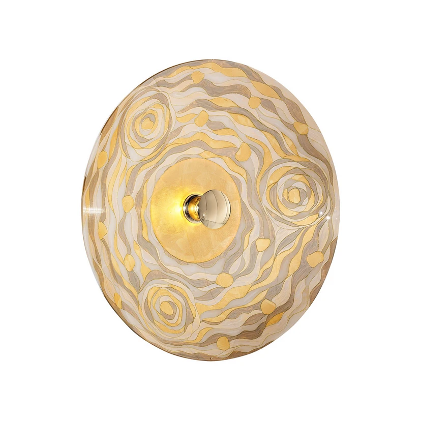 Rund Luna vegglampe med fortryllende dekor Den håndmalte dekoren på Luna vegglampe viser en fantastisk flyt av farger og former i harmoni med det fineste bladgull. 24 karat gullbelagt. Hver lampe er håndlaget og helt unik. Et virkelig blikkfang i stuer og ganger - dimbar utenfra