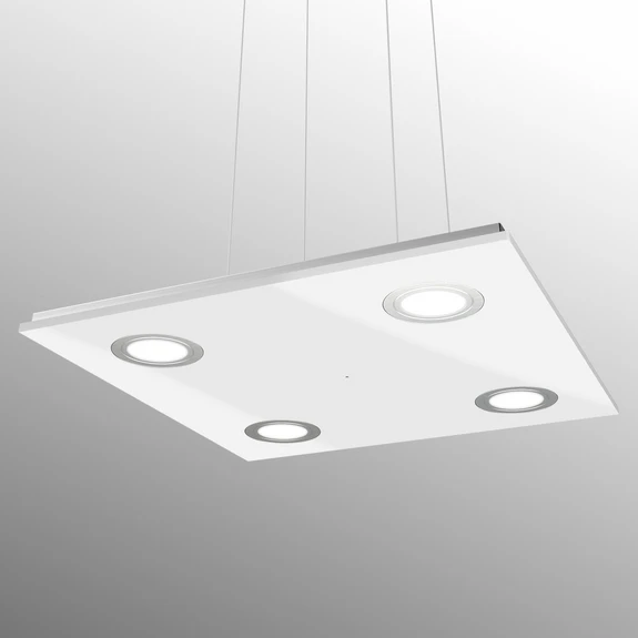 LED-pendellampen Pano er utstyrt med fire LED-spotter som sitter innfelt i en plate av rustfritt stål med deksel i akryl. Platen er kvadratisk med et blått punkt i midten. Dette gir det lille ekstra til denne pendellampen: en IR-bryter som du kan dimme, tenne og slukke lampen med. De varmhvite LED-lysene gjør at pendellampen passer fint i stue eller spisestue hvor du ønsker hyggelig stemning rundt bordet eller i sofaen.
