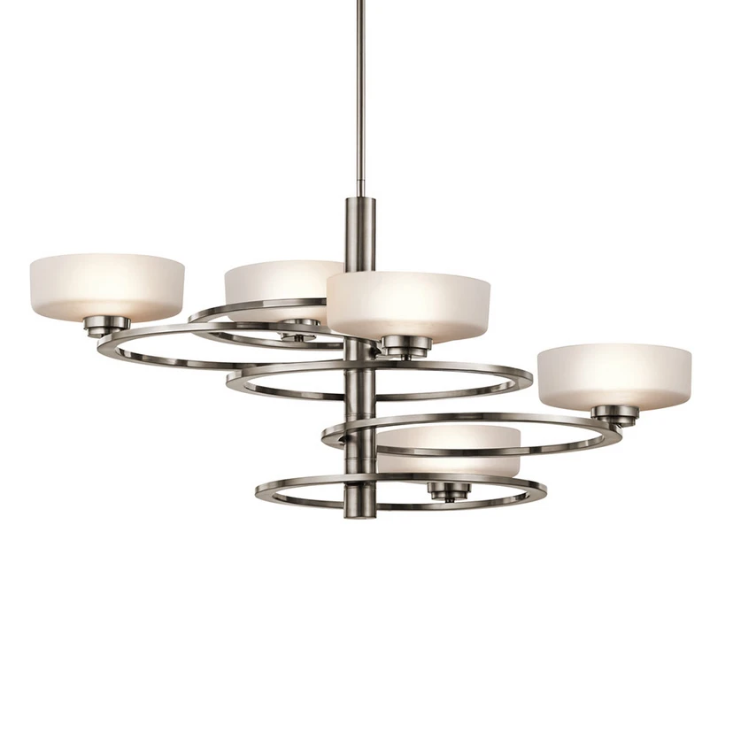 Aleeka-hengelampen med fem lamper er utstyrt med hvite glassfarger: under hvert av brillene er det en konsentrisk formet metallring. Når lyset slås på, kan det lett skapes inntrykk av planeter som kretser rundt solen.