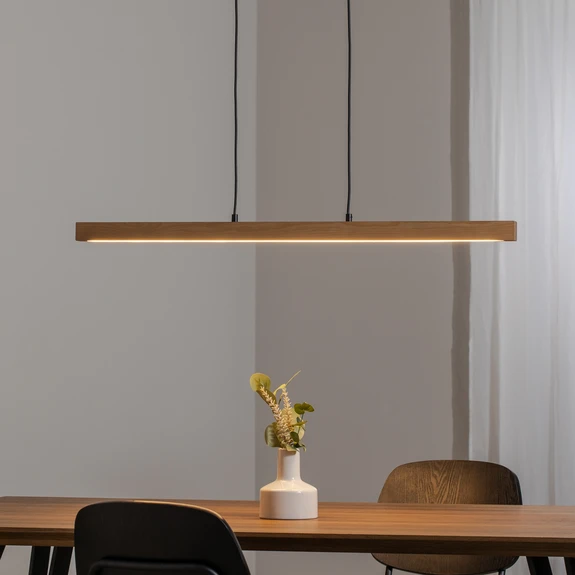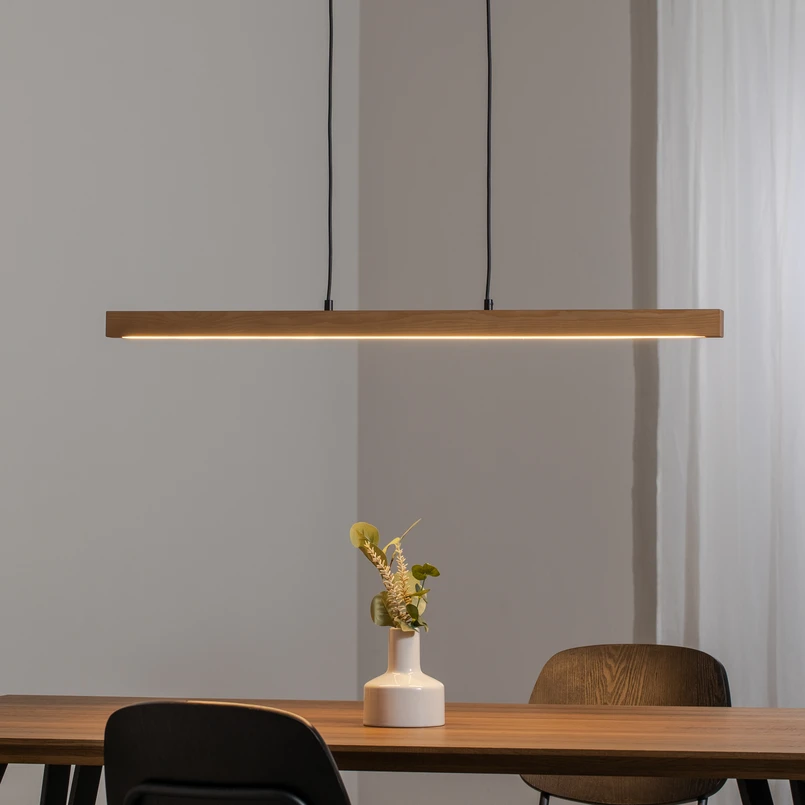 LED-hengelampe Teo, furu, lengde 96 cm, tre, bjelkeform