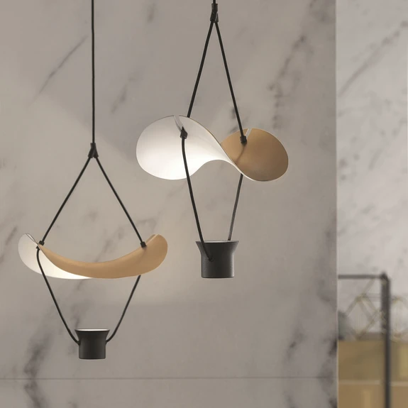 LED-pendellampe -armaturen Vollee består av to deler: den ene delen er LED-spotlight, som henger på to tau og bæres i en liten, sylindrisk, svart holder. Den avgir sitt varme hvite lys oppover. Den andre delen er den nesten flytende, buede skjerm, hvis underside er holdt i hvitt, mens den øvre delen er betydelig mørkere.