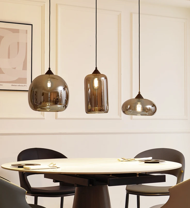Arloris pendellampe med 3 lyskilder og forskjellig formede skjermer i røkt glass - ideell til spisebordet Arloris imponerer med et spesielt preg og er en pendellampe med et individuelt uttrykk, da ingen av de tre skjermene er like. Dette gjelder først og fremst formen, da en skjerm er sylindrisk, en annen er nesten kuleformet og den tredje er flatere og rund. Materialet er imidlertid ensartet, da alle skjermene er laget av glass med en røykgrå, lett skinnende overflate. Dette er ikke bare tiltalende utseendemessig, men også med tanke på lysbildet, som blir litt nedtonet og virker mer koselig. Men siden lampene fortsatt er godt synlige, spesielt når de er slått på, bør du velge et matchende utseende, for eksempel LED-filamentpærer, som er modellert etter klassiske glødepærer. Med sin langstrakte form med 3 lyskilder passer pendellampen Arloris spesielt godt over et spisebord eller til å lyse opp en benk. Lyset ser alltid elegant og sublimt ut og forsterker atmosfæren i rommet.