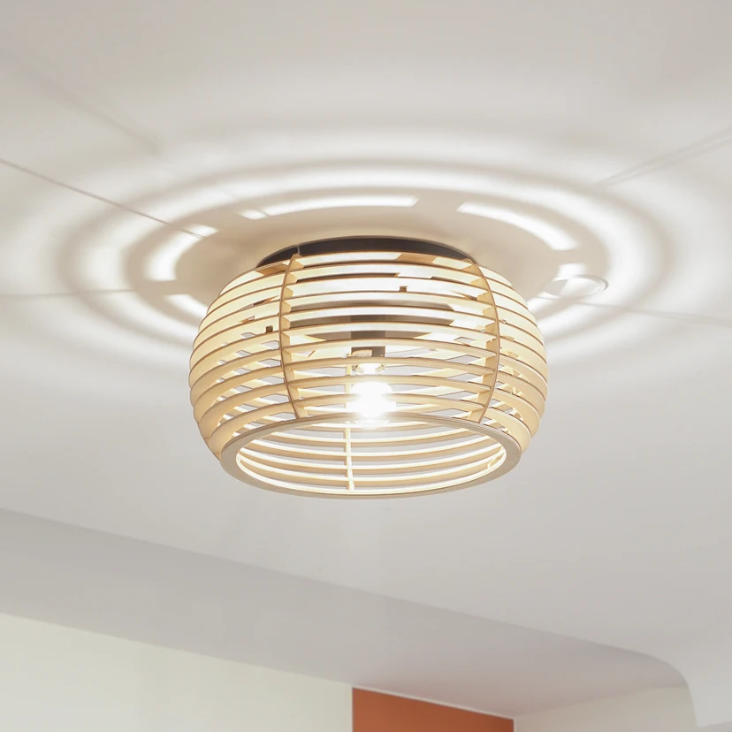Rund Ediz taklampe med flerlagsskjerm i tre Ediz taklampe består av en baldakin i jern og en åpen skjerm i tre. Skjermens fargevalg gir omgivelsene et naturlig preg, som suppleres av baldakinen i moderne svart. Armaturens åpne design skaper en vakker lys- og skyggeeffekt i rommet, og lyset spotlightes både nedover og sidelengs ut. En dekorativ lyskilde er spesielt egnet for belysning. Ediz kan brukes fleksibelt i oppholdsrommet, for eksempel som lyskilde i stuen, gangen, soverommet eller spisestuen.