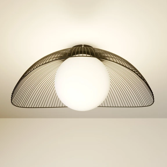 Rund Fabronia taklampe i gitterlook med hvit glasskule Fabronia er et vakkert blikkfang for moderne oppholdsrom, og består av en asymmetrisk utformet gitterskjerm og en komplementerende glasskule. Gitteret eller buret er laget av metall med en svart finish, og stagene er slanke og grasiøse for god sikt. Det opalhvite glasset sørger for en svært myk og behagelig lysfordeling, slik at Fabronia taklampe kan brukes like godt i stuen, soverommet og gangen.