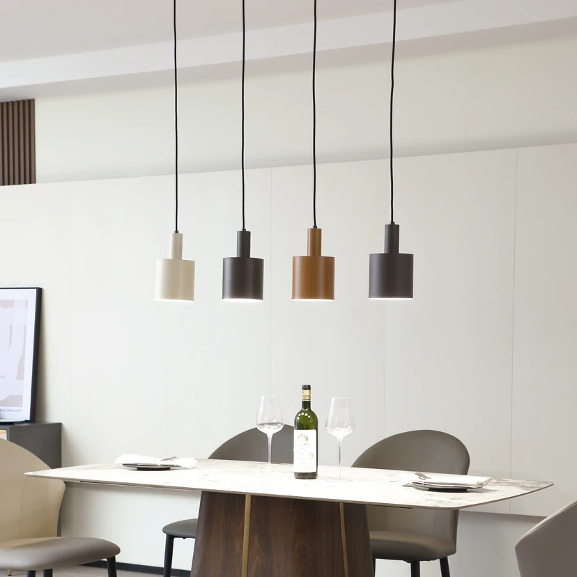 Ovelia 4 lyskilder hengelampe med forskjellige fargede skjermer Ovelia hengelampe er ideell til belysning av et spisebord eller et stuebord. Den er laget av jern og består av en svart baldakin og fire skjermer. Disse er i mørkebrun, kaffebrun og beige og gir pendellampen et spesielt utseende selv når den er slått av. Lyset reflekteres av den hvite innsiden av skjermene og spotlighter mot gulvet.