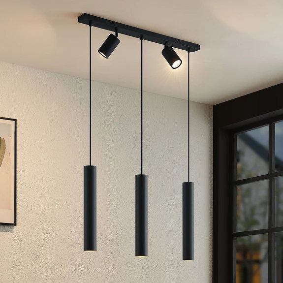 Stilig Sanad pendellampe i sort stål i en langstrakt form Sanad pendellampe imponerer med sitt fasjonable utseende og enkle fargevalg. Tre oppheng er festet til en langstrakt takfeste, og på hvert av dem sitter en rørformet lampeskjerm. Mellom disse opphengene er det også festet en lampeskjerm direkte på takfestet, noe som gjør lampens design til noe helt spesielt. Lampeskjermene kan utstyres med GU10-lyskilder, som genererer den nødvendige belysningen. Sanad hengelampe har en sjenerøs størrelse og et moderne design som gjør at den enkelt kan integreres i mange ulike interiørstiler. Med sin iøynefallende karakter forvandler den ethvert rom til noe helt spesielt og utfyller resten av møblementet.