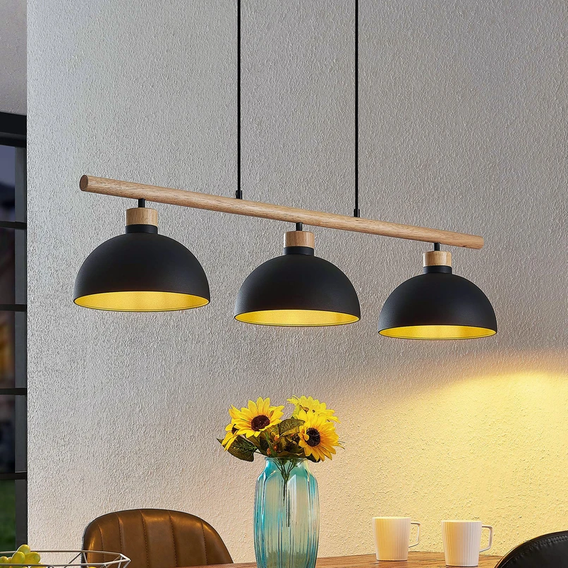 3 lyskilder Tirzana pendellampe til spisestuen med halvkuleformede jernskjermer og trestang Tirzana gir blendingsfritt, nedadrettet lys fordi metallskjermene med svart fargetone er helt ugjennomsiktige og bare åpner seg mot undersiden, slik at lyset slipper ut der på en fokusert måte og lyser opp bord- eller benkeflaten på en god måte. Lampeskjermene er farget gylne på innsiden for spesielt individuelle og koselige lysforhold, noe som gir lyset fra E27-lampene som skal brukes, en fin varm tone. For et matchende utseende er effektive LED-filamentpærer ideelle for drift av pendellampen Tirzana i bjelkeform, da de ligner klassiske glødepærer og derfor er stilrene i design, men også har alle fordelene med moderne LED-teknologi. En stang av lyst gummitre fullfører det tiltalende uttrykket.