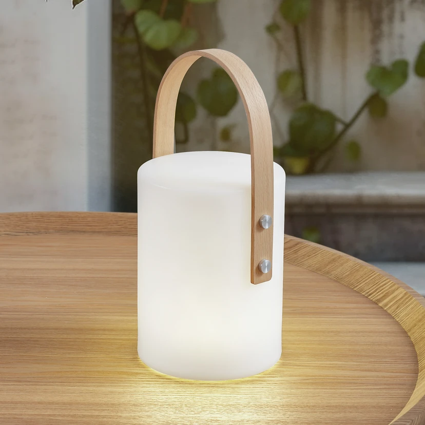 Med justerbar lysfarge - den oppladbare bordlampen Juria LED Den moderne oppladbare bordlampen Juria LED har en enkel, hvit design. Lampekroppen er sylinderformet og prydes av et brunt trehåndtak som fungerer som bærehåndtak. Lysfargen kan justeres ved hjelp av en bryter på bordlampen, og det finnes to alternativer. Juria er også utstyrt med et oppladbart batteri, noe som gjør den helt fleksibel i bruk og ideell for utendørs bruk takket være IP44-klassifiseringen - inkl. USB-C-ladekabel - justerbar lysfarge - 3 000 K eller 6 500 K - batterilevetid 4 timer - ladetid 8 timer