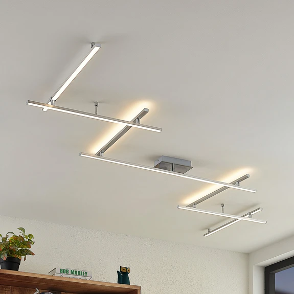 Kerem LED-taklampe i stål med leken design Kerem LED-taklampe imponerer med sin slanke og spennende design. Den er festet til et takfeste og har stivere i ulike størrelser som går i sikksakkmønster og skaper et interessant, langstrakt uttrykk. Lampekroppen er helt i nikkelfarget stål, og de fastmonterte LED-lampene løper langs den interessante formen. Lyset kan slås av og på som vanlig ved hjelp av en veggbryter. Takket være 3-trinns dimmeteknologi med integrert av-funksjon kan den også dimmes til tre ulike lysstyrkenivåer ved å trykke på bryteren flere ganger: 100 %, 40 % og 10 %. Kerem LED-taklampen har et lekent utseende og egner seg spesielt godt som dekorativ belysning i stuen eller på soverommet.