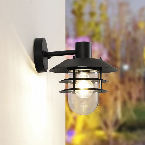 Svart Meliora utendørs vegglampe i tidløs lanterneform Meliora utendørs vegglampe er laget av jern, metall og glass og er designet i en dekorativ lanterneform, noe som gjør den til et vakkert blikkfang i uteområdet selv når den er slått av. Takket være kapslingsgrad IP44 er vegglampen ideell for utendørs bruk. Meliora kan for eksempel brukes som lyskilde i inngangspartiet, på terrassen eller balkongen. Ettersom lyskilden på innsiden er godt synlig, kan den brukes som en dekorativ pære.