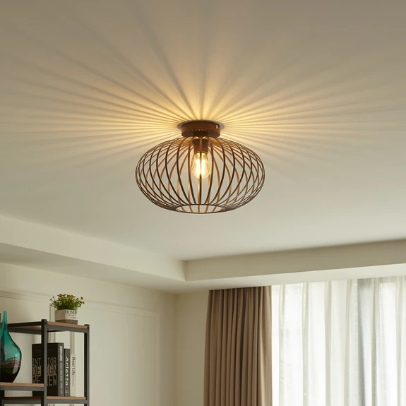 Rund Nahele taklampe med burskjerm Rustikk sjarm omgir Nahele taklampe, som er laget av jern. Den kaffebrune fargen er valgt for å matche lampen, og den står flott til den. Burskjermer er veldig i vinden for tiden og er spesielt attraktive i hjem som er innredet i vintagestil. En pære med glødetråd kommer spesielt godt til sin rett i denne armaturen, siden den kan beundres nesten uhindret av den åpne skjermen og la lyset skinne gjennom. Gitterstagene tegner et spesielt vakkert mønster i taket når lyset er slått på.