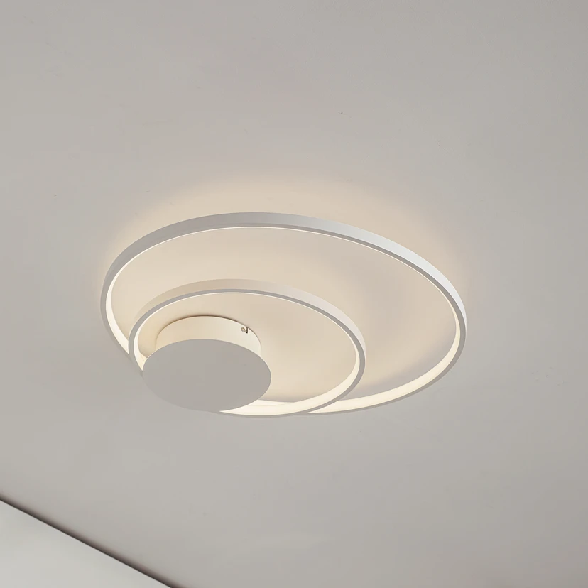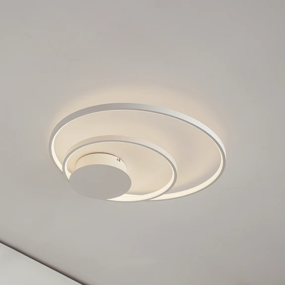 Rund, hvit LED-taklampe Nerwin med to ringer, dimbar via bryter Nerwin imponerer ikke bare med at lyset kan dimmes i tre trinn ved hjelp av den vanlige bryteren, men også med et flott utseende som passer perfekt til moderne interiør. LED-taklampens aluminiumshus er helt hvitt, noe som skaper et spesielt harmonisk utseende, og armaturen består av en stor og en liten ring samt et rundt takfeste, som er plassert på siden i stedet for i midten. Et belysningsobjekt med et helt estetisk utseende! 3-trinns dimbar + off: Lyset kan slås av og på som vanlig ved hjelp av en veggbryter. Takket være 3-trinns dimmeteknologien med integrert av-funksjon kan den også dimmes til tre ulike lysstyrkenivåer ved å trykke på bryteren flere ganger: 100 %, 50 % og 25 %.