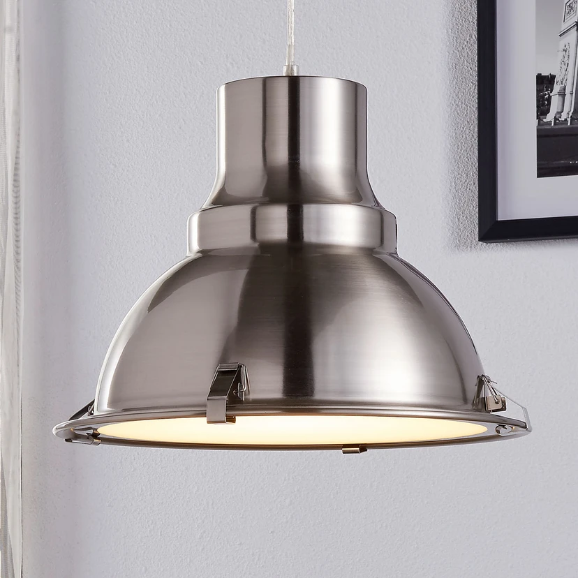 Letty - pendellampe som et ideelt tillegg til spisebordet Industristilen blir stadig mer populær - og på ingen måte bare hos dem som nettopp har innredet loftet sitt. Interiøret her minner sterkt om gjenstander som kunne ha kommet fra en fabrikk, og dette uttrykket har definitivt en viss sjarm. Pendellampen Letty - også den i industristil - har en metallskjerm med en satinert nikkelfinish på utsiden. Dette skaper en kjølig eleganse på et øyeblikk. På undersiden av metallskjermen er det et frostet glassdeksel som får lyset til å skinne jevnere. Med denne pendellampen treffer lyset hovedsakelig flaten under skjermen, og det finnes jo knapt noe bedre egnet sted å montere Letty enn et bord, som da får en relativt koselig belysning.
