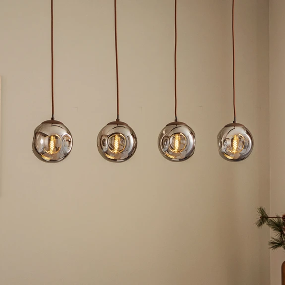 Valentina pendellampe med fire lys og glassskjermer Den moderne Valentina-pendellampen kan brukes fleksibelt i oppholdsrommet. Takket være den diskrete, men moderne fargedesignen smelter den uanstrengt inn i f.eks. kjøkkenet, spisestuen eller stuen. Lyset slippes ut gjennom glasskjermene og skaper en koselig atmosfære i rommet. Skjermene har en rund form med dekorative fordypninger på sidene. Dette gir pendellampen et spesielt uttrykk. Valentina er ideell til å belyse et langt stue- eller spisebord. Dekorative lyskilder egner seg spesielt godt som lyskilder.