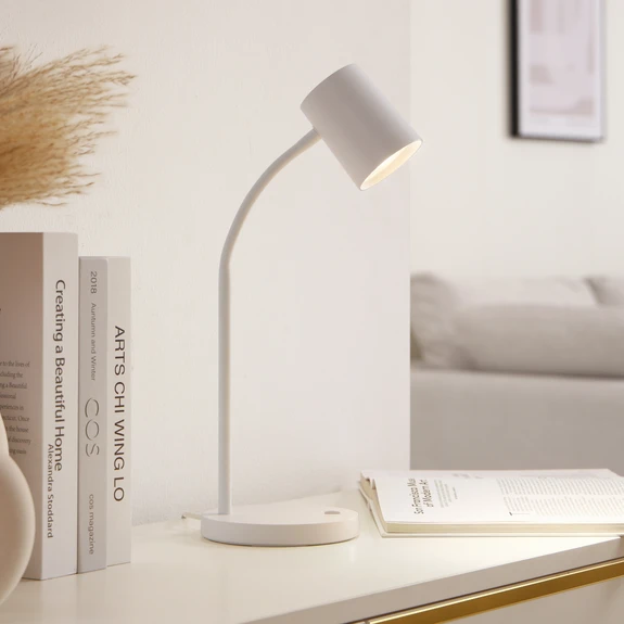 Hvit Radka-bordlampe med fleksibelt stativ Den minimalistiske Radka-bordlampen har en fleksibel arm som gjør at lampehodet kan orienteres etter ønske. En bryter er integrert i sokkelen. Lysstemningen kan påvirkes av valget av GU10-lyskilde. Lysstrålen sendes ut på en målrettet måte ved at lyskilden er plassert litt innover i den spotlignende lampeskjermen.