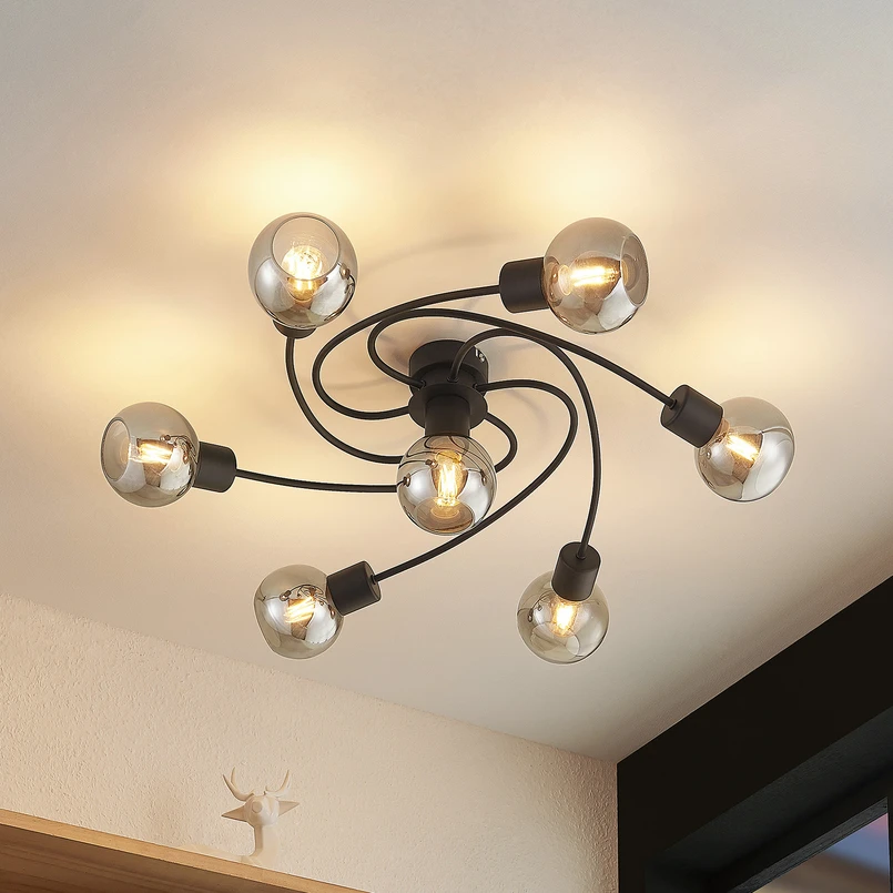 Sju-lys Ciala taklampe - en trendy lyskilde med røkt glass Ciala taklampe har et attraktivt utseende med en mørk design. Armaturen er laget av jern og har en svart finish. Seks lampearmer kommer ut fra det runde takfestet og slynger seg i en spiral rundt det runde sentrum. Lampeskjermene i røkt glass gir armaturen en spesiell karakter og kan enkelt integreres i en moderne stil.