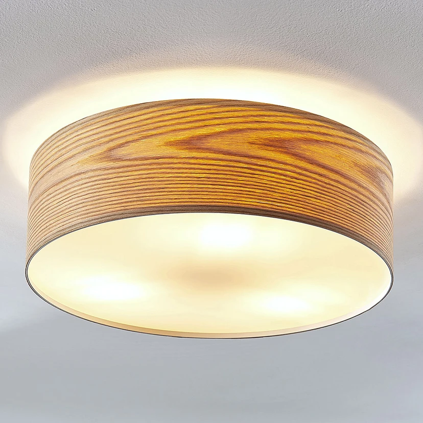 Sylindrisk Dominic taklampe i tre med hvit diffusor for myk lysfordeling Alle som setter pris på treets naturlige uttrykk eller har en forkjærlighet for skandinavisk boligstil, vil helt sikkert finne denne taklampen svært tiltalende. Utsiden av den sylindriske skjermen består av et sirkulært treelement med en svært tynn tykkelse, hvis overflate er lys og vennlig og fremhever treets årer. Taklampen i tre passer like godt i alle oppholdsrom og kan derfor brukes i stuen så vel som på soverommet eller i gangen. Takket være tre E27-fatninger kan du bruke lyskilder etter eget valg, og du er også velkommen til å bruke de nye, energibesparende LED-pærene, som viser seg å være fordelaktige og også scorer poeng med sin lange levetid.