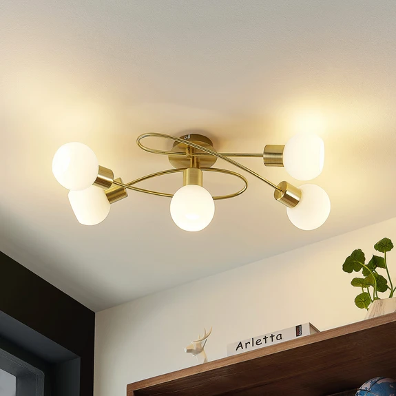 5 lyskilder Elaina taklampe med iøynefallende messingramme Elaina taklampe overrasker med sin trendy messingfinish. Den robuste rammen har en buet form og gir lampen et elegant uttrykk. De fem lyskildene er skjult i halvkuleformede lampeskjermer av opalhvitt glass. Elaina er en passende lyskilde for ulike rom og kan integreres i forskjellige interiørstiler.