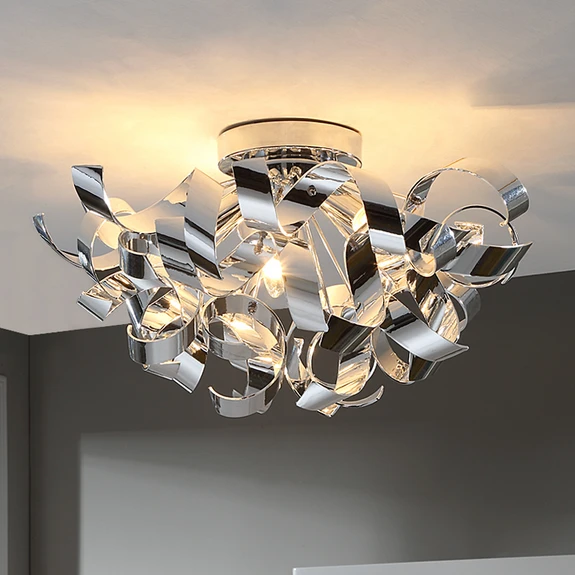 Skinnende krom taklampe Elviro med et flott utseende Taklampen Elviro består av vakkert tvinnede plastbånd som minner om sløyfer, noe du kanskje kjenner igjen som en vakker dekorasjon fra gaveinnpakning. Taklampens elegante effekt forsterkes av at overflaten på plastbåndene er helt forkrommet og derfor utstråler mye glans og storhet. Fatningene E14, som kan utstyres med alle typer pærer, er plassert nær takfestet, og når den er slått på, skaper den reflekterende overflaten på skjermen vakre glitrende effekter.