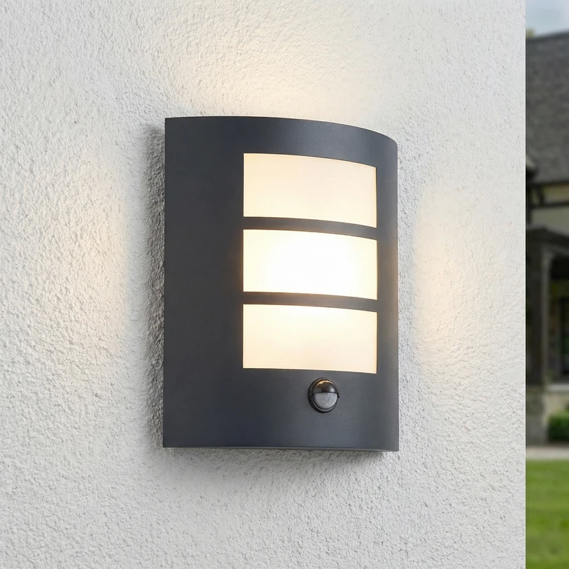Utendørs vegglampe Vimal i kantet design med plastskjerm og integrert bevegelsessensor Med denne vegglampen kan du nyte tiden på balkongen, terrassen eller i hagen selv når det blir mørkt, uten å måtte gi avkall på en koselig lysatmosfære om sommeren. Lampen kan dimmes ved hjelp av en ekstern dimmer (medfølger ikke), slik at du kan tilpasse lysstyrken etter eget ønske, og den er IP44-klassifisert, noe som betyr at den er beskyttet mot inntrengning av faste fremmedlegemer med en diameter på mer enn 1 millimeter og vannsprut. Med sitt stilige utseende er den et dekorativt innslag og oppfyller dermed dine designkrav. Vegglampen er designet for å passe til lyskilder med E27-sokkel. Lampen har et moderne design i svart. Den bader uteområdet ditt i et tiltalende lys med en lyskilde. Aluminium og plast er brukt i produksjonen. Utelampen passer perfekt inn i uteområdet ditt og skaper en herlig stil. Utemøblene dine blir smakfullt komplementert av lyset. Med denne lampen kan du skape en utmerket lysatmosfære når som helst og hvor som helst. Tekniske data Bevegelsessensor - Deteksjonsområde 1-8 m - Deteksjonsvinkel 120° - Anbefalt monteringshøyde 1-3 m