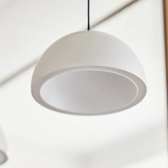Moderne Curve LED-pendellampe - designet som en halvkule Curve LED-pendellampen er en moderne designet lyskilde som er ideell for direkte bord- eller områdebelysning. Lampeskjermen i monokrom aluminium har form som en halvkule som er åpen i bunnen, og i underkanten er det integrert lysdioder som avgir varmhvitt lys med god fargegjengivelse (CRI 90). Ved behov kan lysstyrken styres eksternt ved hjelp av dimmere.