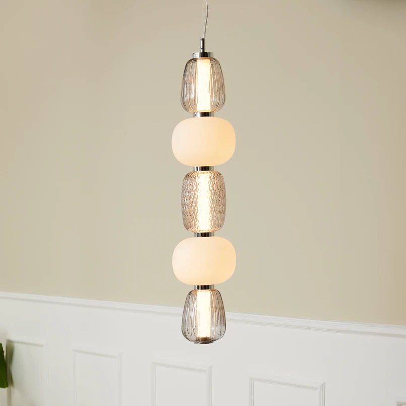 Pearl 5 vertikal LED-pendel med opalt og farget glass og metalldetaljer Pearl 5 LED-pendellampen er et blikkfang for stuer og salonger. Den varmhvite LED-lyskilden er plassert i en rørformet innerskjerm som går gjennom fem blåste glasselementer. To opale glass i oval form kombineres med tre fargede glass i ulike former og teksturer. Lampen har også en sylindrisk baldakin og metalldetaljer.