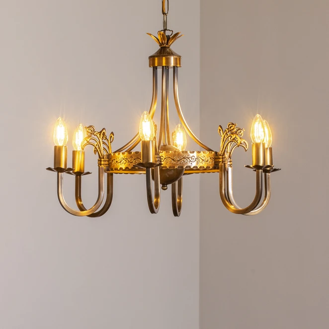 Lysekrone Castle lys patinert med 6 lyskilder kombinerer antikk sjarm med moderne funksjonalitet. Denne lysekronen er laget av høykvalitets metall og har en elegant finish i lys patinert messing, og passer perfekt inn i stuer og spisestuer. De seks pærene sørger for en jevn og imponerende lysfordeling som gir ethvert rom en stilfull atmosfære.