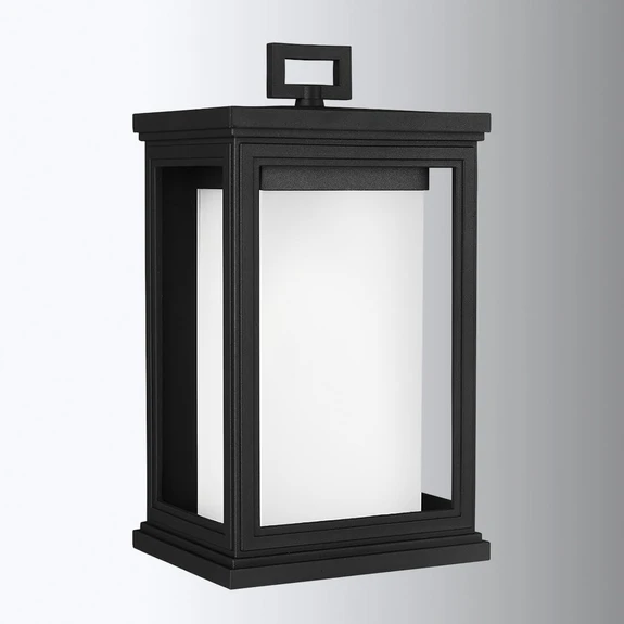 Den sorte lakkerte vegglanteren Roscoe er veldig grei og kan brukes til å belyse utsiden av et hus komfortabelt og veldig dekorativt.